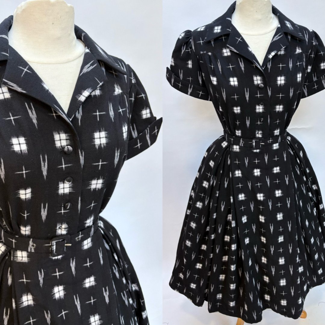This dress features cuffed sleeves, self covered buttons to the waist and a double box pleated full skirt. A matching belt finishes the look to cinch the waist for the classic vintage silhouette. One handy pocket hides away in the right side seam of the skirt, the left side has a concealed zipper opening.